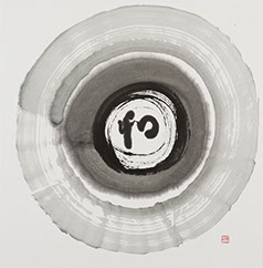 中央で和服を着た女性が神に祈りを捧げているようにも、涙を流しているようにもみえる。つくりの「口」の丸は、禅宗で「一円相」という絶対の真理を表現したもの。「和」は調和の和、平和の和、和をもって尊しとなす(故事成語)。和は日本の心。人のことを思いやって、まるく仲良く調和した世界になりますように。